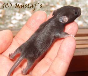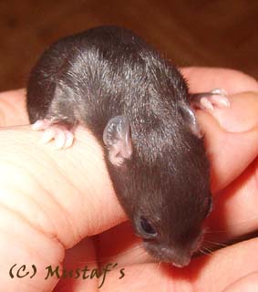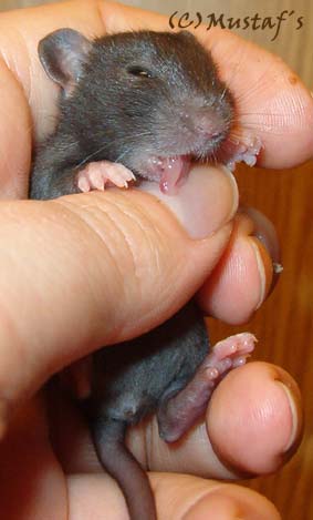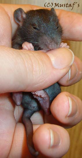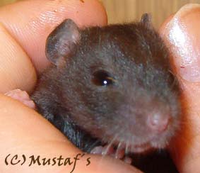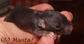 Rotanpoikasen käsiruokinta- Artikkeli ja kuvat © Miia Dyster - Kake syntyi 6.10.2003 Gerbera-emon ensimmäiseen poikueeseen. Synnytys käynnistyi normaalisti ja ajallaan, mutta jokin meni vikaan, sillä lähes kaikki poikaset menehtyivät. Synnytyksen jälkeisenä aamuna järkytyin kun kurkistin Gerberan dunaan: ympäriinsä oli pikkuisia rotanruumiita, osa puoliksi syötyjä, osa linttaantuneita. Nostin Gerberan boksiin dunan siivouksen ajaksi, ja papereita siirrellessäni löysin 3 elossa olevaa poikasta, niistä yksi oli vielä tiiviisti sikiöpussissa. Putsasin poikaset, poistin sikiöpussin ja katkaisin samaiselta rassukalta napanuoran. Ihmeekseni se oli ainoa, jolla oli kuitenkin maitoa vatsassaan. Asetin poikaset varovasti pesään ja saatoin toivoa vain parasta. Iltaan mennessä vain tämä yksi oli jäljellä, ja emo tuntui hoitavan pikkuistaan. Jo toisena päivänä ihmettelin poikasen pientä kokoa ja sitä, ettei sillä tuntunut olevan oikein maitoa mahassaan. Emon maidontuotanto oli hyvin ilmeisesti hyytynyt vähäisen kysynnän vuoksi, ja nyt pikkuinen rassukka oli kuolemassa nälkään silmieni edessä. Kolmantena päivänä maitoa ei tullut, ja mietin itsekseni, ryhtyisinkö epätoivoiseen puuhaan keinoruokkimaan pienenpientä poikasta. Hommana keinoemoilu on enemmän kuin raskas, ja aika harvoin palkitseva :( Lopulta päätin yrittää. Alle viikon vanha poikanen ei paljoa päivässä syö, mutta usein ja lämmintä. Minulla oli helpompi tehtävä kuin täysin orvoksi jääneen ruokkimisessa: emo hoiti pikkuista vauvaa, lämmitti sitä, kakatti ja pissatti sen; minä vain ruokin. Pari päivää vanhan poikasen vatsalaukku on niin pieni, että sinne mahtuu maitoa vain tippa - kaksi kerrallaan. Maidonvastikkeena käytän ihmisten vastiketta (Nestle-Bona: Nan) joka tuntuu sopivan rotalle erinomaisesti. Vastiketta lämmitetään esim. mikrossa pikkuinen liraus kerrallaan n. 38,5 - 39 -asteiseksi, lämmin maito imetään pipettiin, tarkistetaan omaan huuleen ettei maito polta ja tarjotaan vauvalle. Syöttöasennon on oltava sellainen, että poikanen on pystyssä, mielellään pikkuinen etukenossa. Takakenossa/ selällään poikanen vetää maitoa helpommin hengitysteihin ja tukehtumisvaara on suuri. Nimenomaan maidon lämpö aktivoi vauvan ruokahalun, liian viileää maitoa on turha tarjota. Pipetti on minusta välineenä siitä kiitollinen, että se on helppo puhdistaa kunnolla käytön jälkeen (esim. keittämällä). Syöttöväli meillä oli ensimmäisen viikon n. 4-5 tuntia. Toisella viikolla kerta-annos kasvoi selvästi, annoin maitoa niin paljon kuin poikanen vain halusi. Se alkoi pyöristyä ja voimistua, helminauhamainen, ohut kuiva häntä alkoi pullistua ja silmät eivät enää "nousseet" päästä kuin E.T:llä. Pikkuisen karvapeite alkoi kasvaa ja pienet hampaanalut tulla esiin. Kake syntyi K-poikueeseen, ja sen nimeksi tuli Mustaf´s Silvery Kaikista Kaikkein - ilmiselvistä syistä. Kake-lempinimi vaan jäi päälle, vaikka vauva olikin pieni, kaunis tyttö. Kaikkien äitien tavoin Kake on minusta vähintäänkin ihmeellinen, se on _niin_ kaunis, _niin_ taitava ja _niin_ suloinen. Kake avasi silmät jo 11 päivää vanhana ja pesi itsensä ensimmäisen kerran 13 päivän ikäisenä. 14 päivää vanhana se maistoi ekan kerran kiinteää ravintoa (puolukka-marjapuuroa) sormenpäästäni nuollen. Vaikka se on pulska ja sopusuhtainen, 15 päivää vanhana se oli jokseenkin puolet pienempi kuin samanikäiset poikaset meillä yleensä. Kake 14 vrk
